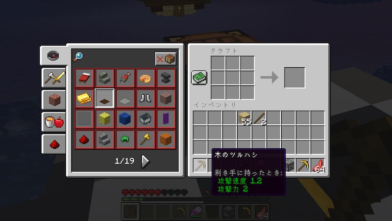 金のツルハシは耐久値が低く、今使うのはもったいない気がするので、羊島?の下のディスペンサーにあった木材を使って木のツルハシを作りました。
