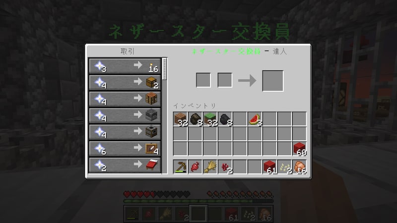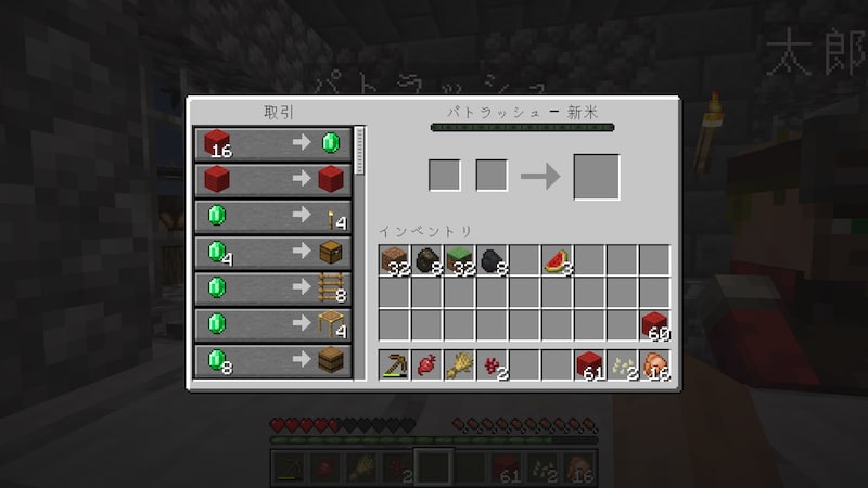 例の羊毛をエメラルドと交換して、エメラルドをいろいろなアイテムと交換できるみたいです。