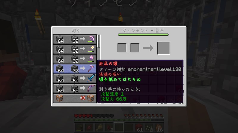 岩盤で強いアイテムが交換できます。このクワは最強クラスの武器っぽいです。消滅の呪いがついていますが。