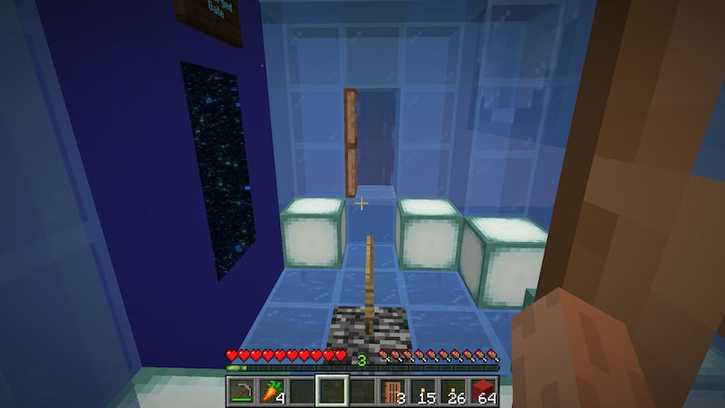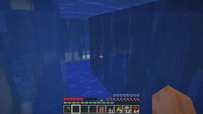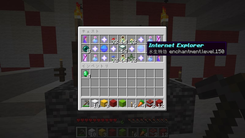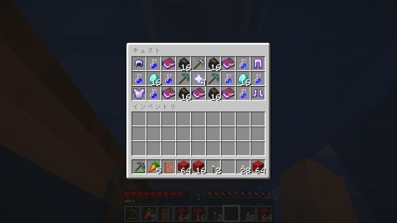 チェストに入ってたアクエリアス(だったかな?)というポーションの効果を知るために飲んでみると、水中呼吸と移動速度上昇が付きました。これは水中探検に使えるかも知れません。ただ、移動速度上昇は水中では効果ないかな?